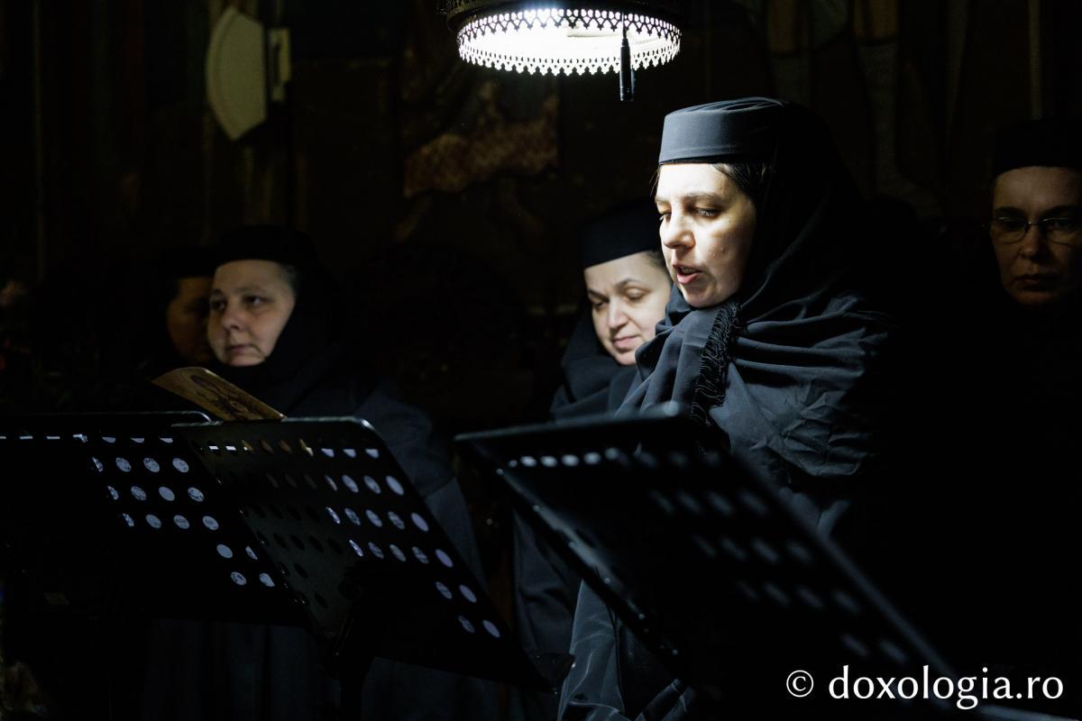 La slujba privegherii a slujit un sobor de preoți și diaconi sub protia părintelui arhimandrit Elisei Nedescu, starețul Mănăstirii „Sfinții Trei Ierarhi” din Iași, iar răspunsurile liturgice au fost date de Corul preoțesc „Apostolii” (în strana dreaptă) și, respectiv, de corul mănăstirii Copou (în strana stângă).